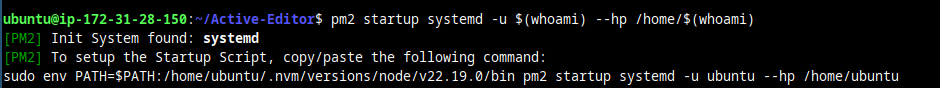 pm2 startup systemd -u $(whoami) --hp /home/$(whoami)systemd: The init system used by modern Linux distros (like Amazon Linux 2, Ubuntu 16+).